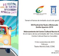 Santo Domingo, November 20, 2019 – The Ministry of Culture officially opened on November 19 the XIXth “Emilio Aparicio” 2019 Amateur Theater Festival. The festival was part of the program organized to celebrate the 12th anniversary of the Narciso González Cultural Center in Santo Domingo. The event opened at 7:00 p.m. in the popular community … Continue reading "Ministry of Culture Opens XIXth “Emilio Aparicio” Amateur Theater Festival 2019"